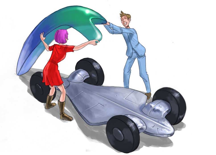 Første gang hun prøvede at skifte karrosseri blev hun godt nok overrasket over hvor let det er. Hendes sportskarrosseri består af ti ganske tynde plader, som hægtes sammen. Pladerne vejer en 2-3 kilo stykket, undtagen dørene, der er lidt tungere. Førhen blev de fleste biler bygget af stål eller aluminium, og det var selvfølgelig langt tungere end de kulfibre man bruger nu.