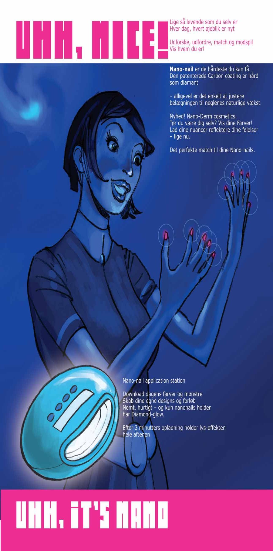 Nanettes negle er lakerede for længst. Og, indrømmet, det var heller ikke helt billigt, men så behøver hun heller ikke at tænke på dét den næste måneds tid. ”Nano-nail” lakeringen består af flere lag; inderst er et tyndt lag med partikler, der kan skifte farve og endda oplades til at lyse lidt op. Ovenpå det er der lagt en belægning af diamant. Det er slut med flækkede eller afskallede negle.